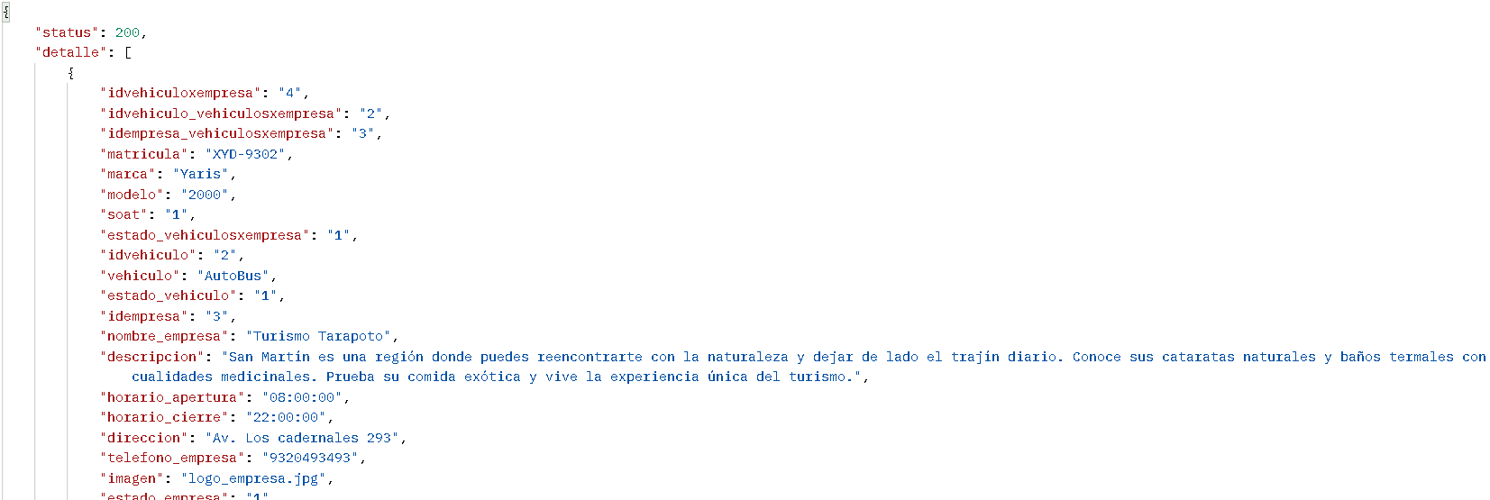 El resultado del envío de un vehículo por empresa en específico debería ser como se muestra en la siguiente imagen: